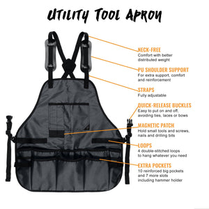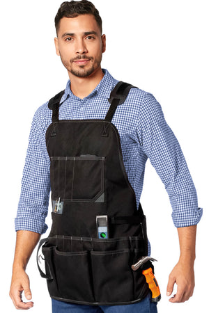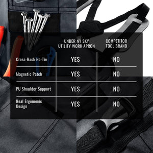 STURDY CONSTRUCTION, EXCLUSIVE MAGNETIC HOLDER – Safe and reinforced design, protecting you against spills and flying debris while offering the convenience of having everything you need at hand: 10 double stitched big pockets and 7 more slots to safely organize your hammers, phone, pen, scissors, blades, screws, pencils, knives and other tools. Plus, 4 double stitched loops AND an exclusive Magnetic Patch to hold screws, nails, screwdriver, drilling bits, pins, bolts, and small tools in general.