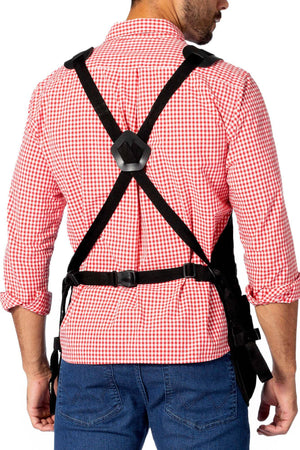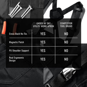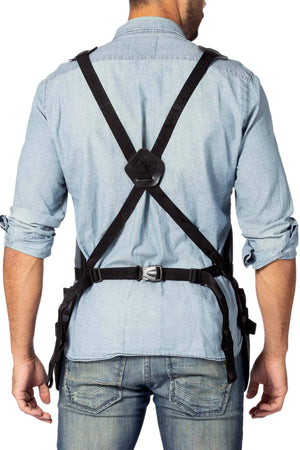 NO MORE TIES, LACES OR BOWS - This is the only apron in the market with our Cross-Back and No-Tie design: It is the only one in the market with our Cross-Back and No-Tie design: The straps are protected by a PU Leather shoulder support and fully adjustable with quick-release buckles so you can close and open it in a snap, ergonomically designed to distribute weight evenly across your shoulders, avoiding neck pain.