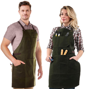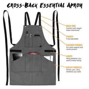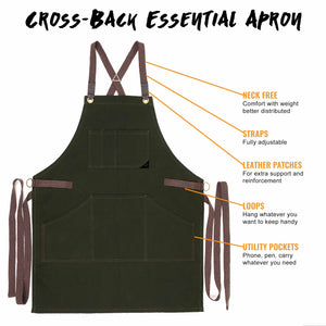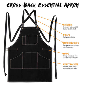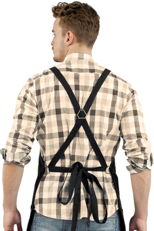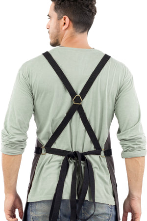 COMFORT AND ADJUSTABLE DESIGN – Prevent neck pain with our adjustable CROSS BACK strap design and GENUINE LEATHER reinforcements. The apron coverage goes from chest to knee with split-leg.