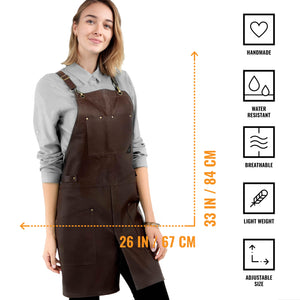 Craftsmanship Guarantee and Universal Fit: Measures 27 x 35 inches to fit heights from 5 ft 2 in to 6 ft 5 in, with waist sizes ranging from 27 to 60 inches. A professional solution created by a small business dedicated to hand-finishing and premium hardware for chefs, cooks, servers, restaurants, barbers, hairstylists, and hospitality workers