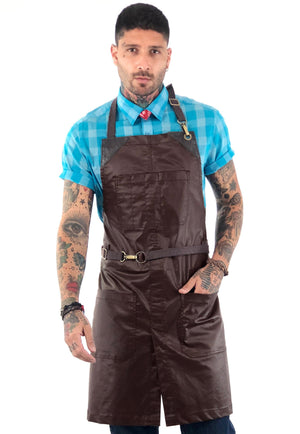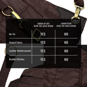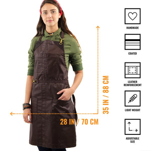 HANDCRAFTED, DURABLE QUALITY – This apron is handmade with durable mid-weight 8 oz twill, COATED with an extra protection coverage against dust, hair, flour and liquids, reinforced with genuine leather patches, 100% cotton straps to avoid allergies and guarantee your comfort, and anti-corrosion anti-allergy Zamak coated vintage brass hardware, grommets and clasps for extra support. Double stitched utility pockets and thick top and bottom hems for strength and structure.