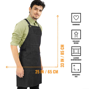 LEATHER REINFORCED STRAPS, HANDCRAFTED, DURABLE QUALITY – This apron is handmade with durable mid-weight 8 oz cotton twill with elastane, 100% cotton straps to avoid allergies and guarantee your comfort, reinforced with genuine leather patches, durable anti-rust vintage brass metal hardware, grommets, with anti-allergic Zamak coating for extra support. Double-stitched utility pockets and thick top and bottom hems for strength and structure.