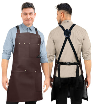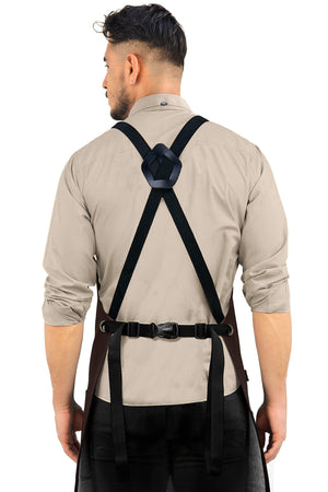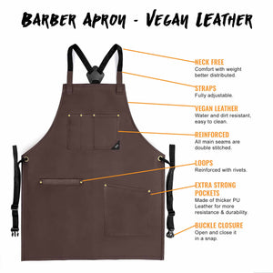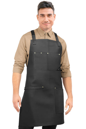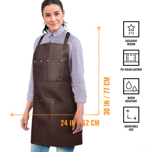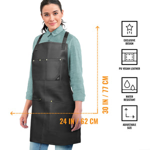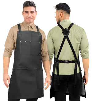 PU LEATHER APRON - CROSS-BACK DESIGN WITH VEGAN LEATHER BODY, POCKETS, LOOPS, AND STRAPS -This Apron is designed with cross-back straps with a buckle fastening system so you can open and close them in a snap. Its pocket is riveted and double stitched being 1 big lap pocket that fit all you need and 1 chest pocket with slots to keep your tools and phone in hand. Plus, 1 multi-utility loop, perfect for towels or extra large tools. All handcrafted with the best quality PU leather: water-resistant, and hard for liquids, dust, hair, and flour to get absorbed by the apron, all while making it easier for you to wipe down or spot-clean it.