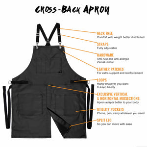 PROFESSIONAL STYLE – This apron is a true workwear, fitting most bodies and activities, offering you great comfort, durability, and functionality. It has a clean design, with many utility pockets: easy access phone and pencil pockets on the front chest, and large Lap pockets to fit all the tools and accessories that you need. Sleek matte black color for a professional look, and functional & stylish gun-metal hardware.